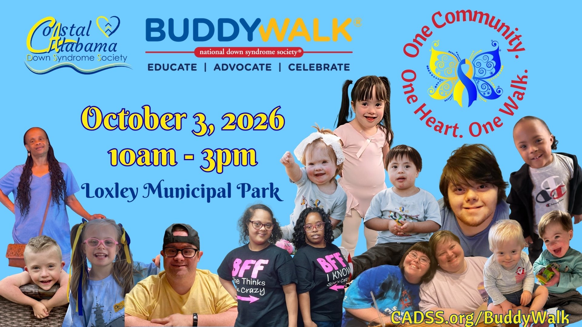 Since 2008, the Coastal Alabama Down Syndrome Society (CADSS) has hosted its annual Buddy Walk, promoting acceptance and inclusion of individuals with Down Syndrome. Our 2026 Buddy Walk will be held Saturday, October 3rd, at the Loxley Municipal Park. Along with the one mile walk, our event also features games for all ages, special guests, a DJ, food, and much more. Last year’s walk attracted more than 1000 people!